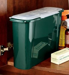 Slimline Compost Caddy. Collect kitchen compostables out-of-sight and odor-free! The Slimline Kitchen Compost Caddy is designed to fit in a cabinet or under the sink without taking up valuable kitchen space. It comes with a carbon filter in the lid to combat odors, and ten biodegradable cornstarch liner bags to get you started. Fill the lined caddy with nutrient-rich food waste and then tote the liner and all out to your composter-easy and mess free! Recycled plastic construction. Size 16"L x 5-1/2"W x 10-1/2"H holds approx. 2-1/2 gallons